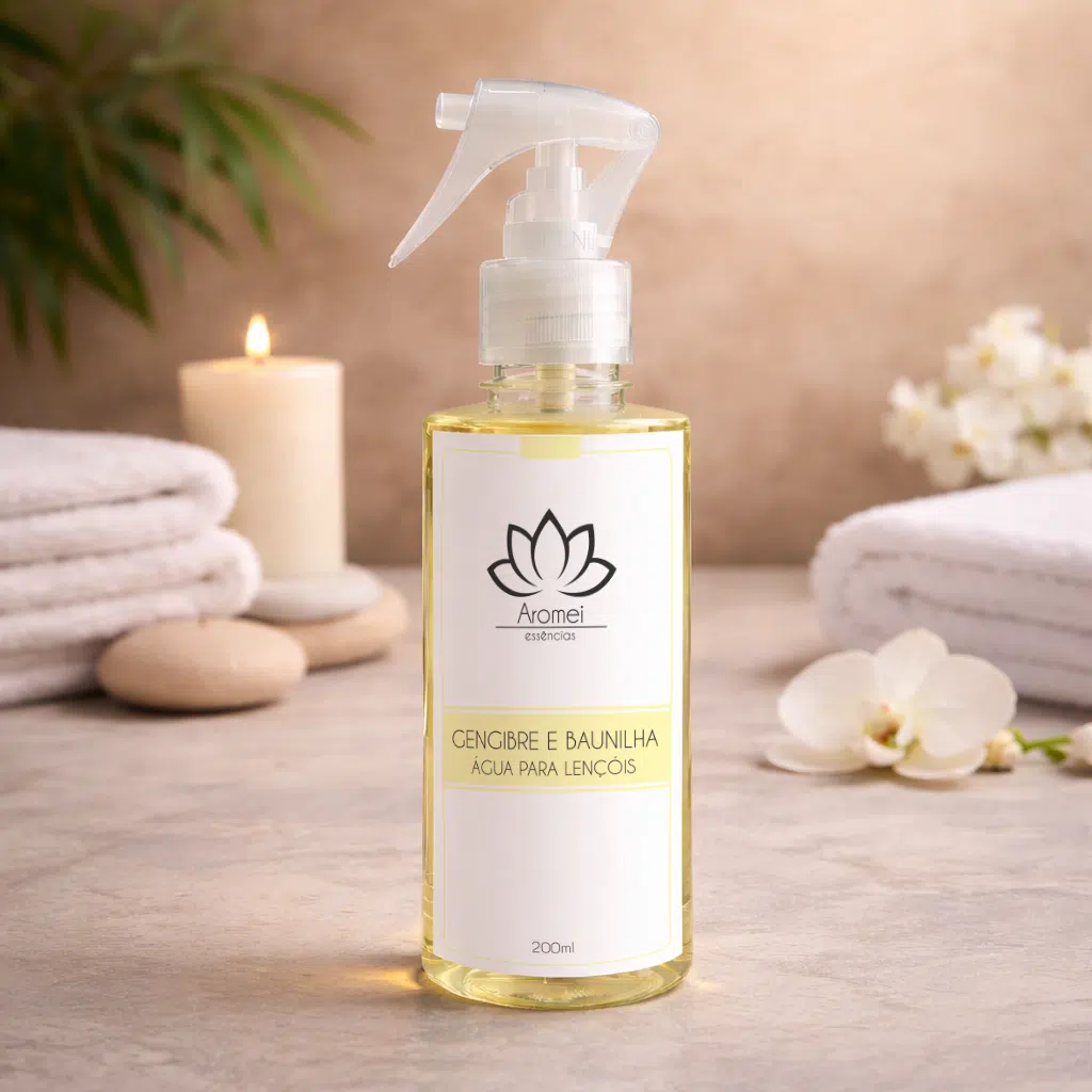 🛒 Adicione ao carrinho e descubra o aroma envolvente da Água para Lençóis Gengibre e Baunilha da Aromei!